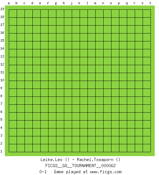 Last move : 0-1 2020 April 23 8:40:45 [Event "FICGS__GO__TOURNAMENT__000062"] [Site "FICGS"] [Date "2020.03.23"] [Round "1"] [Black "Leike,Leo"] [White "Rachel,Tosaporn"] [Result "0-1"] 0-1 This go game has been lost on time (started : 2020.03.23 22:24:10) Here are the names of the openings (joseki) played in the four corners : Player White won this Go (weiqi, baduk) game. Follow this game move after move (download)You have to like to win, and to learn to recognize the errors that gave you the victory. (Pierre Audouard) If we don't succeed, we run the risk of failure. (George W. Bush)
