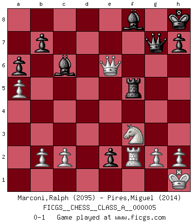Last move : 0-1 2006 September 19 1:21:31 [Event "FICGS__CHESS__CLASS_A__000005"] [Site "FICGS"] [Date "2006.06.20"] [Round "1"] [White "Marconi,Ralph"] [Black "Pires,Miguel"] [Result "0-1"] [WhiteElo "2095"] [BlackElo "2014"] 1.e4 c5 2.Nf3 d6 3.d4 cxd4 4.Nxd4 Nf6 5.Nc3 a6 6.f4 e5 7.Nf3 Qc7 8.a4 Be7 9.Bd3 O-O 10.O-O Nc6 11.Kh1 Nb4 12.Bd2 Bd7 13.a5 Rac8 14.Be3 Bc6 15.Bb6 Qb8 16.Nh4 g6 17.f5 d5 18.exd5 Nfxd5 19.Nxd5 Nxd5 20.fxg6 fxg6 21.Qg4 Nf4 22.Bxg6 Kh8 23.Ba7 Qxa7 24.Rxf4 Rxf4 25.Qxc8+ Bf8 26.Bf5 Qc5 27.Qe6 Qe7 28.Nf3 Qg7 29.Rf1 e4 30.Nd2 e3 31.Nf3 e2 32.Rf2 Rxf5 0-1 Sicilian : Najdorf, 6.f4 Kingside Castling by player Black (move 9) Kingside Castling by player White (move 10) Player Black won this chess game. Follow this game move after move (download)Look at Garry Kasparov. After he loses, invariably he wins the next game. He just kills the next guy. That's something that we have to learn to be able to do. (Maurice Ashley) Über Kasparov: Es ist offensichtlich, daß er in einem totalitären Staat aufwuchs und deshalb zu diktatorischen Zügen neigt. (Viktor Kortschnoi) El Ajedrez no es como la vida... ¡tiene reglas!. (Mark Pasternak) Des combinaisons [dans le jeu d'échecs] pareilles à des mélodies. Je crois entendre pour ainsi dire la musique des coups... (Vladimir Nabokov) Gambling is the son of avarice and the father of despair. (French proverb)