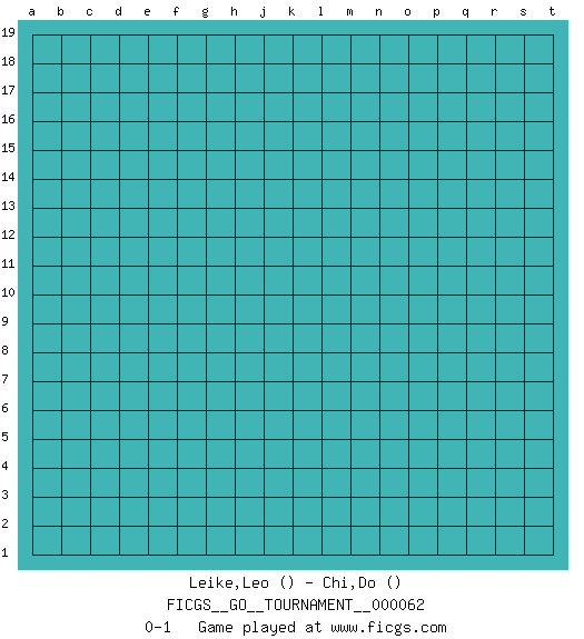 Last move : 0-1 2020 April 23 8:40:45 [Event "FICGS__GO__TOURNAMENT__000062"] [Site "FICGS"] [Date "2020.03.23"] [Round "1"] [Black "Leike,Leo"] [White "Chi,Do"] [Result "0-1"] 0-1 This go game has been lost on time (started : 2020.03.23 22:24:10) Here are the names of the openings (joseki) played in the four corners : Player White won this Go (weiqi, baduk) game. Follow this game move after move (download)Keshi is worth as much as an invasion ! (Anonymous) 98% of all statistics are made up. (Author unknown)