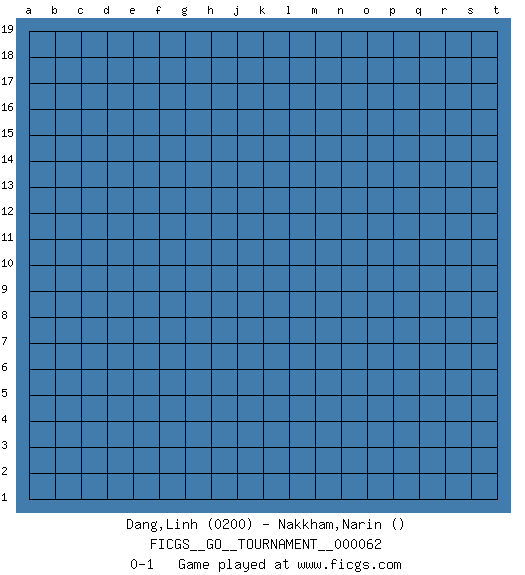 Last move : 0-1 2020 April 23 8:40:45 [Event "FICGS__GO__TOURNAMENT__000062"] [Site "FICGS"] [Date "2020.03.23"] [Round "1"] [Black "Dang,Linh"] [White "Nakkham,Narin"] [Result "0-1"] [Rating 1 "0200"] 0-1 This go game has been lost on time (started : 2020.03.23 22:24:10) Here are the names of the openings (joseki) played in the four corners : Player White won this Go (weiqi, baduk) game. Follow this game move after move (download)Never try to cut bamboo joints. (Anonymous) The problem with manipulation is that people can turn on you. (Horatio Caine, C.S.I. Miami)