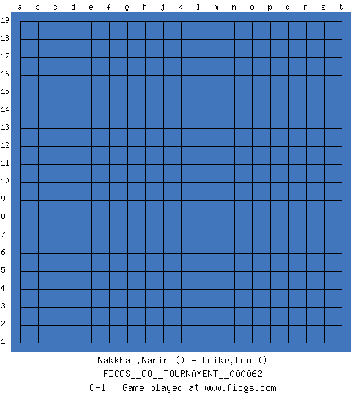 Last move : 0-1 2020 April 23 8:40:45 [Event "FICGS__GO__TOURNAMENT__000062"] [Site "FICGS"] [Date "2020.03.23"] [Round "1"] [Black "Nakkham,Narin"] [White "Leike,Leo"] [Result "0-1"] 0-1 This go game has been lost on time (started : 2020.03.23 22:24:10) Here are the names of the openings (joseki) played in the four corners : Player White won this Go (weiqi, baduk) game. Follow this game move after move (download)One big eye kills one small eye. (Anonymous) It's unlucky to be superstitious. (Dave Enteles)