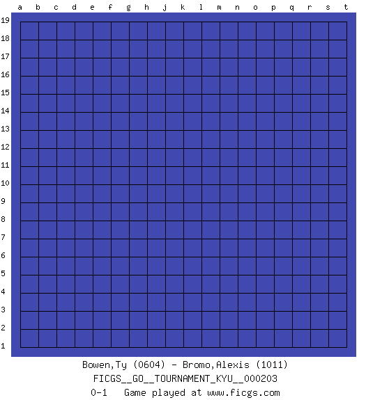 Last move : 0-1 2020 April 23 8:40:45 [Event "FICGS__GO__TOURNAMENT_KYU__000203"] [Site "FICGS"] [Date "2020.03.24"] [Round "1"] [Black "Bowen,Ty"] [White "Bromo,Alexis"] [Result "0-1"] [Rating 1 "0604"] [Rating 2 "1011"] 0-1 This go game has been lost on time (started : 2020.03.24 7:24:26) Here are the names of the openings (joseki) played in the four corners : Player White won this Go (weiqi, baduk) game. Follow this game move after move (download)Only amateurs try to come up with fancy moves. (Anonymous) Strategy without tactics is the slowest route to victory. Tactics without strategy is the noise before defeat. (Sun Tzu)