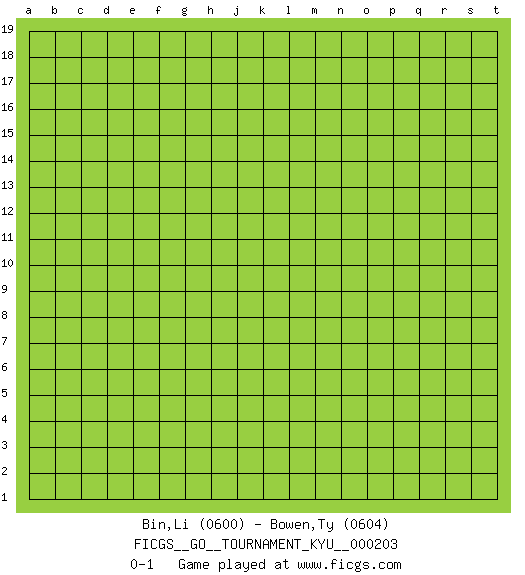 Last move : 0-1 2020 April 23 8:40:45 [Event "FICGS__GO__TOURNAMENT_KYU__000203"] [Site "FICGS"] [Date "2020.03.24"] [Round "1"] [Black "Bin,Li"] [White "Bowen,Ty"] [Result "0-1"] [Rating 1 "0600"] [Rating 2 "0604"] 0-1 This go game has been lost on time (started : 2020.03.24 7:24:26) Here are the names of the openings (joseki) played in the four corners : Player White won this Go (weiqi, baduk) game. Follow this game move after move (download)Balance is not what players strike for, and if it does arise, it is in spite of them. (Pierre Audouard) There are 10 types of people in this world: those who understand binary and those who don't. (Anonymous)