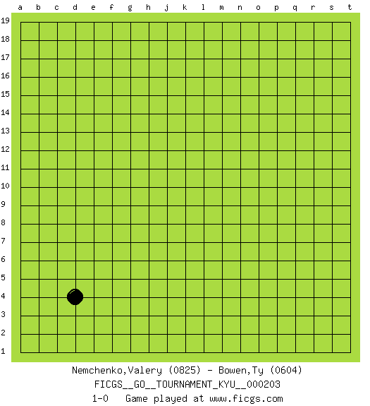 Last move : 1-0 2020 April 23 21:28:34 [Event "FICGS__GO__TOURNAMENT_KYU__000203"] [Site "FICGS"] [Date "2020.03.24"] [Round "1"] [Black "Nemchenko,Valery"] [White "Bowen,Ty"] [Result "1-0"] [Rating 1 "0825"] [Rating 2 "0604"] 1.d4 1-0 This go game has been lost on time (started : 2020.03.24 7:24:26) Here are the names of the openings (joseki) played in the four corners : Corner d4 : d4 1-0 Hoshi (Hwajeom, Seongjeom, Xingwei`) 4-4 Point. The star or hoshi (4-4) point, emphasizing influence at the potential expense of territory. Player Black won this Go (weiqi, baduk) game. Follow this game move after move (download)Add one stone, then sacrifice both. (Anonymous) If you ain't just a little scared when you enter a casino, you are either very rich or you haven't studied the games enough. (Pappy)