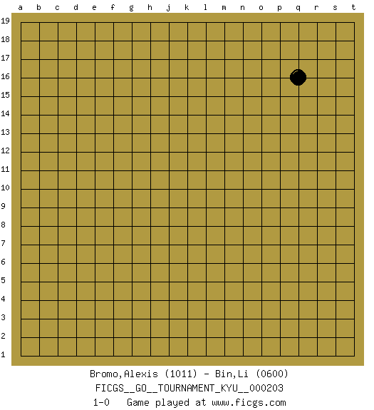 Last move : 1-0 2020 May 11 18:24:43 [Event "FICGS__GO__TOURNAMENT_KYU__000203"] [Site "FICGS"] [Date "2020.03.24"] [Round "1"] [Black "Bromo,Alexis"] [White "Bin,Li"] [Result "1-0"] [Rating 1 "1011"] [Rating 2 "0600"] 1.q16 1-0 This go game has been lost on time (started : 2020.03.24 7:24:26) Here are the names of the openings (joseki) played in the four corners : Player Black won this Go (weiqi, baduk) game. Follow this game move after move (download)Those who are good at winning, don't usually fight. (Zhang) Art is the triumph over chaos. (John Cheever)