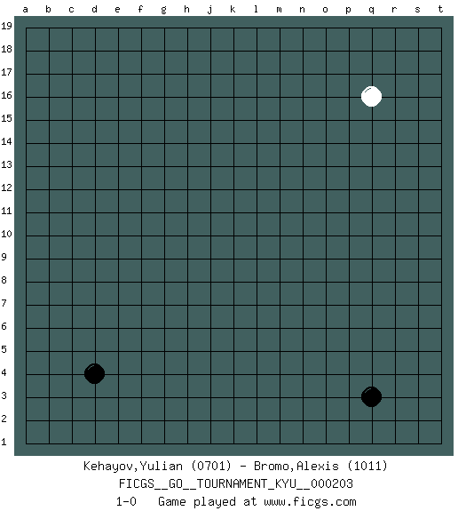 Last move : 1-0 2020 April 27 14:51:52 [Event "FICGS__GO__TOURNAMENT_KYU__000203"] [Site "FICGS"] [Date "2020.03.24"] [Round "1"] [Black "Kehayov,Yulian"] [White "Bromo,Alexis"] [Result "1-0"] [Rating 1 "0701"] [Rating 2 "1011"] 1.d4 q16 2.q3 1-0 This go game has been lost on time (started : 2020.03.24 7:24:26) Here are the names of the openings (joseki) played in the four corners : Corner q4 : q3 1-0 Komoku (Somok, Xiao~mu`) 3-4 Point. The komoku (3-4) point is the traditional corner enclosure move.. Player Black won this Go (weiqi, baduk) game. Follow this game move after move (download)Don't count territory held by only one eye. (Anonymous) The faster the computer, the slower the brain. (Thibault de Vassal)