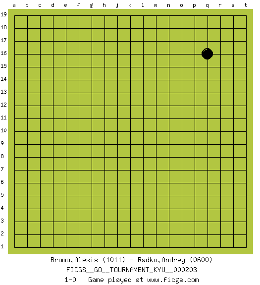 Last move : 1-0 2020 May 11 18:24:43 [Event "FICGS__GO__TOURNAMENT_KYU__000203"] [Site "FICGS"] [Date "2020.03.24"] [Round "1"] [Black "Bromo,Alexis"] [White "Radko,Andrey"] [Result "1-0"] [Rating 1 "1011"] [Rating 2 "0600"] 1.q16 1-0 This go game has been lost on time (started : 2020.03.24 7:24:26) Here are the names of the openings (joseki) played in the four corners : Player Black won this Go (weiqi, baduk) game. Follow this game move after move (download)Corner, side, centre. (Anonymous) Crush them ! Make them suffer ! (General Grievous in Star Wars ep.3)