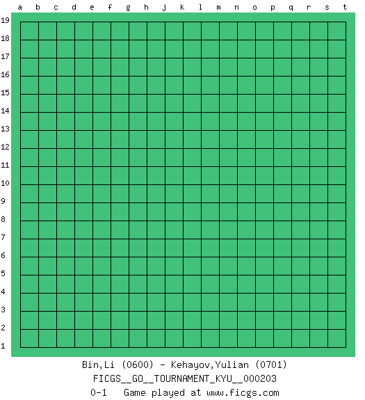 Last move : 0-1 2020 April 23 8:40:45 [Event "FICGS__GO__TOURNAMENT_KYU__000203"] [Site "FICGS"] [Date "2020.03.24"] [Round "1"] [Black "Bin,Li"] [White "Kehayov,Yulian"] [Result "0-1"] [Rating 1 "0600"] [Rating 2 "0701"] 0-1 This go game has been lost on time (started : 2020.03.24 7:24:26) Here are the names of the openings (joseki) played in the four corners : Player White won this Go (weiqi, baduk) game. Follow this game move after move (download)Atari, atari is vulgar play. (Anonymous) If you know the enemy and know yourself you need not fear the results of a hundred battles. (Sun Tzu)