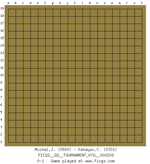 Last move : 0-1 2020 April 23 8:40:45 [Event "FICGS__GO__TOURNAMENT_KYU__000203"] [Site "FICGS"] [Date "2020.03.24"] [Round "1"] [Black "Michal,Jean Pierre"] [White "Kehayov,Yulian"] [Result "0-1"] [Rating 1 "0500"] [Rating 2 "0701"] 0-1 This go game has been lost on time (started : 2020.03.24 7:24:26) Here are the names of the openings (joseki) played in the four corners : Player White won this Go (weiqi, baduk) game. Follow this game move after move (download)The poor player plays the opponent's game for him. (Anonymous) War is the child of passion, passion is the child of narcissism and narcissism is the child. (...) Another game ? (Thibault de Vassal)