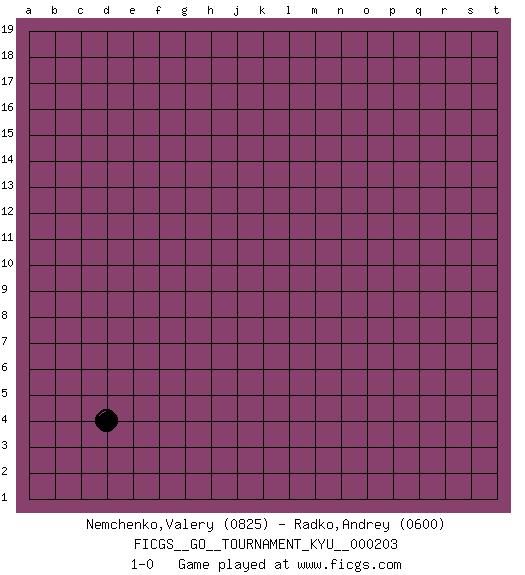 Last move : 1-0 2020 April 23 21:28:34 [Event "FICGS__GO__TOURNAMENT_KYU__000203"] [Site "FICGS"] [Date "2020.03.24"] [Round "1"] [Black "Nemchenko,Valery"] [White "Radko,Andrey"] [Result "1-0"] [Rating 1 "0825"] [Rating 2 "0600"] 1.d4 1-0 This go game has been lost on time (started : 2020.03.24 7:24:26) Here are the names of the openings (joseki) played in the four corners : Corner d4 : d4 1-0 Hoshi (Hwajeom, Seongjeom, Xingwei`) 4-4 Point. The star or hoshi (4-4) point, emphasizing influence at the potential expense of territory. Player Black won this Go (weiqi, baduk) game. Follow this game move after move (download)The strong player plays straight, the weak diagonally. (Anonymous) The only sure thing about luck is that it will change. (Wilson Mizner)