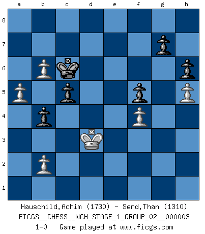 Last move : 1-0 2007 September 21 12:8:51 [Event "FICGS__CHESS__WCH_STAGE_1_GROUP_02__000003"] [Site "FICGS"] [Date "2007.07.11"] [Round "1"] [White "Hauschild,Achim"] [Black "Serd,Than"] [Result "1-0"] [WhiteElo "1730"] [BlackElo "1310"] 1.e4 c6 2.d4 d5 3.Nc3 dxe4 4.Nxe4 Bf5 5.Ng3 Bg6 6.Nf3 Nd7 7.h4 h6 8.h5 Bh7 9.Bd3 Bxd3 10.Qxd3 e6 11.Bf4 Ngf6 12.O-O-O Be7 13.Kb1 O-O 14.Ne5 Nxe5 15.dxe5 Qxd3 16.Rxd3 Nd5 17.Bd2 Rfd8 18.Rd1 Kf8 19.Ne4 Ke8 20.g4 Nb6 21.Be3 Rxd3 22.Rxd3 Rd8 23.Rxd8+ Kxd8 24.Bxb6+ axb6 25.f4 Kd7 26.c4 b5 27.c5 b4 28.Kc2 f5 29.gxf5 exf5 30.Nd6 b6 31.cxb6 Bxd6 32.exd6 Kxd6 33.a4 c5 34.Kd3 Kc6 35.a5 1-0 Caro-Kann : Classical variation Queenside Castling by player White (move 12) Kingside Castling by player Black (move 13) Player White won this chess game. Follow this game move after move (download)The boy (then a 12 year old boy named Anatoly Karpov) doesn't have a clue about Chess, and there's no future at all for him in this profession. (Mikhail Botvinnik) Ihnen, Herr Lasker, habe ich nur drei Worte zu sagen: Schach und matt. (Siegbert Tarrasch) El Ajedrez es tan inspirador que yo no creo que un buen jugador sea capaz de tener un pensamiento malo durante una partida. (Wilhelm Steinitz) On n'a jamais que l'âge auquel on a commence à jouer aux échecs car après on cesse de vieillir. (Capablanca) Nowadays, anyone who cannot speak English and is incapable of using the Internet is regarded as backward. (Al-Waleed bin Talal)