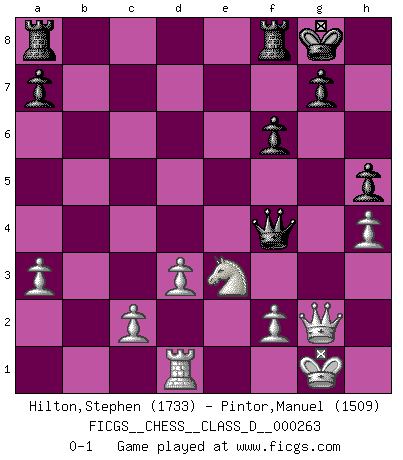 Last move : 0-1 2020 April 5 19:6:15 [Event "FICGS__CHESS__CLASS_D__000263"] [Site "FICGS"] [Date "2020.03.24"] [Round "1"] [White "Hilton,Stephen"] [Black "Pintor,Manuel"] [Result "0-1"] [WhiteElo "1733"] [BlackElo "1509"] 1.b4 e5 2.Bb2 Qf6 3.a3 d5 4.Nf3 d4 5.g3 c5 6.bxc5 Bxc5 7.d3 b6 8.Bg2 Bb7 9.O-O Nd7 10.Nbd2 Ne7 11.Nxe5 Bxg2 12.Nxd7 Qc6 13.Nxc5 Bxf1 14.Qxf1 bxc5 15.Nc4 O-O 16.Bc1 Qg6 17.Qg2 Nf5 18.Bf4 h5 19.Ne5 Qe6 20.h4 Ne7 21.Nf3 f6 22.e3 Ng6 23.exd4 Nxf4 24.gxf4 cxd4 25.Nxd4 Qd6 26.Nf5 Qd7 27.Ne3 Qd4 28.Rd1 Qxf4 0-1 Polish (Sokolsky) opening Kingside Castling by player White (move 9) Kingside Castling by player Black (move 15) Player Black won this chess game. Follow this game move after move (download)The boy (then a 12 year old boy named Anatoly Karpov) doesn't have a clue about Chess, and there's no future at all for him in this profession. (Mikhail Botvinnik) Es gibt Leute, die glauben, alles wäre vernünftig, was man mit einem ernsthaften Gesicht tut. (Georg Christoph Lichtenberg) Coloca el contenido del tablero de Ajedrez en un sombrero, agita las piezas vigorosamente, derrámalas en el tablero desde una altura de medio metro y así obtienes el estilo de Wilhelm Steinitz. (H. E. Bird) Toutes choses étant égales, c'est la conviction qui gagne. Alliée à une volonté de vaincre, elle sert de détonateur, suscite des idées, disperse les doutes et aide à penser clairement. (Robert Fischer) The worth of a book is to be measured by what you can carry away from it. (James Bryce)