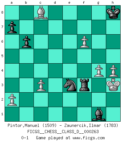 Last move : 0-1 2020 April 13 20:8:25 [Event "FICGS__CHESS__CLASS_D__000263"] [Site "FICGS"] [Date "2020.03.24"] [Round "1"] [White "Pintor,Manuel"] [Black "Zaunercik,Ilmar"] [Result "0-1"] [WhiteElo "1509"] [BlackElo "1783"] 1.e4 e5 2.f4 exf4 3.Nf3 g5 4.Bc4 Nc6 5.d4 g4 6.O-O gxf3 7.Qxf3 Qe7 8.Bxf4 Nxd4 9.Qh5 Nf6 10.Qe5 Nxc2 11.Qxc7 Nxa1 12.e5 Qc5+ 13.Qxc5 Bxc5+ 14.Kh1 O-O 15.exf6 Nc2 16.Rf3 Re8 17.Rg3+ Kh8 18.h4 Re4 19.Bxf7 Re1+ 20.Kh2 Bg1+ 21.Kh3 d6 22.Rg4 h5 23.Bxh5 Bxg4+ 24.Bxg4 Rxb1 25.Bxd6 Rf1 26.Be5 Re8 27.Bc3 Re3+ 28.g3 Rxc3 29.bxc3 Ne3 30.Bc8 b6 31.g4 Rf3+ 0-1 KGA : Blachly gambit Kingside Castling by player White (move 6) Kingside Castling by player Black (move 14) Player Black won this chess game. Follow this game move after move (download)It began to feel as though you were playing against Chess itself. - On playing against Robert Fischer. (Walter Shipman) Capablanka war das größte Genie der Schachgeschichte! Aber denken sie nicht er habe nichts vom Schach verstanden. Er wusste nur soviel wie er wissen musste um seine Ziele zu erreichen. (Mikhail Moiseyevich Botvinik) No puedes jugar al Ajedrez si eres de corazón noble. (Proverbio Francés) Il (Jacob Murray) ne joue pas pour le bon coup, mais pour le meilleur. (Eloi Relange) No, I am still playing. (Anatoly Karpov)
