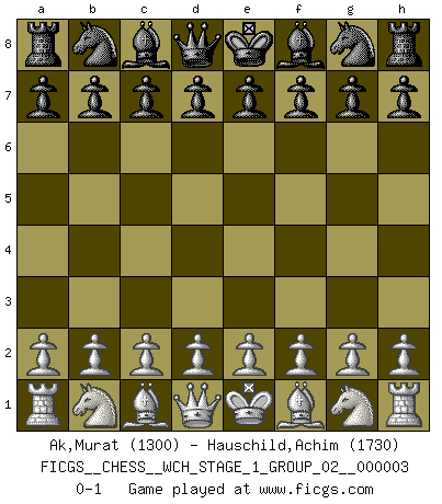Last move : 0-1 2007 August 10 21:3:22 [Event "FICGS__CHESS__WCH_STAGE_1_GROUP_02__000003"] [Site "FICGS"] [Date "2007.07.11"] [Round "1"] [White "Ak,Murat"] [Black "Hauschild,Achim"] [Result "0-1"] [WhiteElo "1300"] [BlackElo "1730"] 0-1 This chess game has been lost on time (started : 2007.07.11 16:50:31) Player Black won this chess game. Follow this game move after move (download)We like to think. (Gary Kasparov) Versuche, dich von der Sklaverei der Eröffnungsvarianten zu befreien. Stattdessen soll man gewisse Typenpositionen erlernen, die man eingehend analysiert. (Aaron Nimzowitsch) Todos los jugadores de Ajedrez deberían tener un pasatiempo. (Savielly Tartakower) Il n'y a plus de joueurs du niveau de Jacob Murray dont la seule quête est le beau jeu, le plaisir de voir les pièces construire quelque chose. Sur 10 idées à la minute, 9 seront sans intérêt, la dernière s'avèrera géniale. (Christian Bauer) Men never do evil so completely and cheerfully as when they do it from religious conviction. (Blaise Pascal)