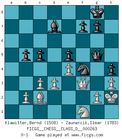Last move : 0-1 2020 August 13 0:39:17 [Event "FICGS__CHESS__CLASS_D__000263"] [Site "FICGS"] [Date "2020.03.24"] [Round "1"] [White "Klawitter,Bernd"] [Black "Zaunercik,Ilmar"] [Result "0-1"] [WhiteElo "1508"] [BlackElo "1783"] 1.e4 e5 2.Nf3 Nc6 3.Bb5 a6 4.Ba4 Bc5 5.O-O Nf6 6.c3 O-O 7.d3 b5 8.Bc2 Bb7 9.Be3 Bxe3 10.fxe3 Ng4 11.Qe2 d6 12.Nbd2 Ne7 13.h3 Nf6 14.a4 Ng6 15.axb5 axb5 16.Nb3 Qd7 17.Nfd2 Rxa1 18.Rxa1 Ra8 19.Rxa8+ Bxa8 20.Nf1 d5 21.exd5 Qxd5 22.e4 Qd8 23.Nc1 Nf4 24.Qe3 N6h5 25.Ne2 Nxe2+ 26.Qxe2 Nf4 27.Qf3 h5 28.Kh2 h4 29.Bb1 c5 30.Nd2 Qg5 31.Nf1 Bc6 32.Bc2 Bd7 0-1 Ruy Lopez : Classical defense deferred Kingside Castling by player White (move 5) Kingside Castling by player Black (move 6) Player Black won this chess game. Follow this game move after move (download)Before the endgame, the Gods have placed the middle game. (Siegbert Tarrasch) Bobby Fischer ist kein Vorbild für die heutige Jugend. (Viktor Kortschnoi) El Ajedrez lo es todo: arte, ciencia y deporte. (Anatoly Karpov) Les pièces de l'échiquier étaient impitoyables. Elles le retenaient, elles l'absorbaient. Il y avait de l'horreur en cela, mais aussi une harmonie unique. Car, qu'y a-t-il dans le monde, à part les échecs ? (V. Nabokov) Do you know these so called Volunteers don't even get paid! (Simpsons)