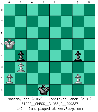 Last move : 1-0 2021 April 17 23:45:56 [Event "FICGS__CHESS__CLASS_A__000227"] [Site "FICGS"] [Date "2020.03.24"] [Round "1"] [White "Maceda,Coco"] [Black "Tanriover,Taner"] [Result "1-0"] [WhiteElo "2162"] [BlackElo "2131"] 1.e4 e5 2.Nf3 Nc6 3.Bb5 Nf6 4.O-O d6 5.d3 Bd7 6.Re1 a6 7.Bxc6 Bxc6 8.d4 Be7 9.Nc3 exd4 10.Nxd4 Bd7 11.Qf3 O-O 12.h3 h6 13.Bf4 b5 14.Rad1 b4 15.Nce2 Re8 16.c4 c5 17.Nf5 Bxf5 18.exf5 d5 19.h4 d4 20.Nc1 Rc8 21.Nd3 h5 22.Bg5 Ng4 23.Qb7 Bxg5 24.Rxe8+ Qxe8 25.hxg5 Rb8 26.Qc7 Rc8 27.Qg3 Qe2 28.Re1 Qd2 29.g6 Rf8 30.Re7 fxg6 31.fxg6 Ne3 32.fxe3 Qxd3 33.Qd6 Qf5 34.Kh2 Qg4 35.Qg3 Qxg3+ 36.Kxg3 h4+ 37.Kxh4 Rd8 38.exd4 cxd4 39.Re2 Kf8 40.Kg3 Rd6 41.Kf3 d3 42.Rd2 Ke7 43.Ke4 Rxg6 44.Kd5 a5 45.b3 Rg3 46.Kc6 Ke6 47.c5 Ke5 48.Kb7 Kd4 49.c6 Rg5 50.Rd1 Rb5+ 51.Ka6 Rc5 52.Kb6 Rc3 53.c7 Ke3 54.Kb7 Ke2 55.Ra1 d2 56.c8Q Rxc8 57.Kxc8 g5 58.Kc7 g4 59.Kb6 d1Q 60.Rxd1 Kxd1 61.Kxa5 1-0 Follow this game move after move (download)In a gambit you give up a Pawn for the sake of getting a lost game. (Samuel Standige Boden) Ich trinke, ich rauche, ich spiele, ich liebe Frauen aber Fernschach ist ein Laster, das ich nicht habe. (Mikhail Nekhemyevich Tal) El Ajedrez es un regaderazo frío para la mente. (Sir John Simon) D'abord les bases : Jouez et étudiez, puis étudiez et jouez, ensuite jouez et étudiez, puis étudiez et jouez. Deuxièmement : Donnez toujours le meilleur de vous-même ! (Ken Smith) After growing wildly for years, the field of computing appears to be reaching its infancy. (John Pierce)
