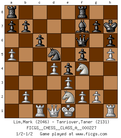 Last move : 1/2-1/2 2020 September 19 18:29:37 [Event "FICGS__CHESS__CLASS_A__000227"] [Site "FICGS"] [Date "2020.03.24"] [Round "1"] [White "Lim,Mark"] [Black "Tanriover,Taner"] [Result "1/2-1/2"] [WhiteElo "2046"] [BlackElo "2131"] 1.d4 d5 2.c4 e6 3.Nc3 Nf6 4.cxd5 exd5 5.Bg5 c6 6.e3 h6 7.Bh4 Be7 8.Bd3 Ne4 9.Bxe7 Qxe7 10.Bxe4 dxe4 11.Nge2 O-O 12.Ng3 f5 13.Nce2 Be6 14.Nf4 Kh7 15.h4 Nd7 16.h5 Qf6 17.Rc1 Nb6 18.a4 Bf7 19.a5 Nd5 20.Nge2 1/2-1/2 QGD : Exchange, positional line, 5...c6 Kingside Castling by player Black (move 11) This chess game ended in a draw. Follow this game move after move (download)If your opponent cannot do anything active, then don't rush the position; instead you should let him sit there, suffer, and beg you for a draw. (Jeremy Silman) Privat ist Kortschnoi kein schlechter Mensch, sehr sympathisch. Aber während des Spiels ist er grausam. Er will dich töten. (Miguel Najdorf) El tablero es el mundo, las piezas es el fenomeno del universo, las reglas del juego son lo que llamamos leyes de la naturaleza y el jugador del lado opuesto, se encuentra oculto a nuestra vista. (Thomas Huxley) Les échecs, c'est la lutte contre l'erreur. (Johannes Zukertort) Life is verb, not a noun. (Charlotte Perkins Gilman)
