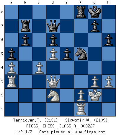 Last move : 1/2-1/2 2020 November 10 12:5:30 [Event "FICGS__CHESS__CLASS_A__000227"] [Site "FICGS"] [Date "2020.03.24"] [Round "1"] [White "Tanriover,Taner"] [Black "Slawomir,Weglicki"] [Result "1/2-1/2"] [WhiteElo "2131"] [BlackElo "2109"] 1.e4 e5 2.Nf3 Nc6 3.Bc4 Bc5 4.O-O d6 5.c3 Nf6 6.b4 Bb6 7.a4 a6 8.d3 a5 9.b5 Ne7 10.Nbd2 Ng6 11.d4 O-O 12.Re1 c6 13.h3 Re8 14.Bd3 Be6 15.Rb1 h6 16.Ba3 Rb8 17.Qc2 Nf4 18.Bf1 Nh7 19.Qd1 Qc7 20.Kh2 Nf6 21.g3 Ng6 22.Qc2 cxb5 23.Bxb5 Rec8 24.Qd3 Ba7 25.Bb2 Qe7 26.Qe2 Bd7 27.Kg2 Ne8 28.Nc4 Nc7 29.Bxd7 Qxd7 30.d5 Ne8 31.Ncd2 Bc5 32.Ra1 b6 33.Red1 Ne7 34.c4 Bb4 35.Rdb1 f5 36.exf5 Nxf5 37.Ne4 Qf7 38.Ba3 Bxa3 39.Rxa3 Nf6 40.Nxf6+ Qxf6 41.Nd2 Qf7 42.Qd3 Rf8 43.Rf1 Rb7 44.Rb3 Qd7 45.Ra3 1/2-1/2 Follow this game move after move (download)If cunning alone were needed to excel, women would be the best Chess players. (Albin) Der Verteidiger gebe der Gewalt nach, aber nur der Gewalt. Er schaffe sich nicht freiwillig, etwa aus Blindheit oder aus Schrecken, irgendwelche Schwächen. Er lasse sich nicht bluffen. (Emanuel Lasker) El ganar no lo es todo... pero el perder es nada. (Mednis) Il n'y a pas de prix trop élevé au scalp de l'ennemi. (Koblentz) The only thing that matters is the evidence. (Horatio Caine, C.S.I. Miami)