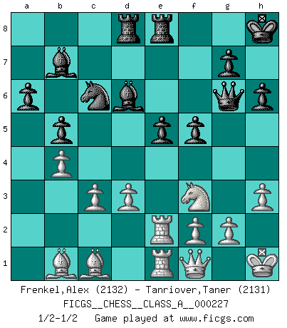 Last move : 1/2-1/2 2020 September 2 17:39:24 [Event "FICGS__CHESS__CLASS_A__000227"] [Site "FICGS"] [Date "2020.03.24"] [Round "1"] [White "Frenkel,Alex"] [Black "Tanriover,Taner"] [Result "1/2-1/2"] [WhiteElo "2132"] [BlackElo "2131"] 1.e4 e5 2.Nf3 Nc6 3.Bb5 a6 4.Ba4 Nf6 5.O-O Be7 6.Re1 b5 7.Bb3 O-O 8.h3 Bb7 9.d3 d6 10.c3 Na5 11.Bc2 c5 12.a3 Re8 13.Nbd2 h6 14.Nf1 Bf8 15.b4 Nc6 16.Ne3 d5 17.exd5 Nxd5 18.Nxd5 Qxd5 19.Be3 Rad8 20.Re2 cxb4 21.axb4 Qe6 22.Bd2 Bd6 23.Qf1 Qg6 24.Re3 f5 25.Rae1 Bc7 26.R3e2 Kh7 27.Kh1 Bb8 28.Bb1 Kh8 29.Bc1 Bd6 1/2-1/2 Ruy Lopez : Closed, 7...O-O Kingside Castling by player White (move 5) Kingside Castling by player Black (move 7) This chess game ended in a draw. Follow this game move after move (download)Don't even mention losing to me. I can't stand to think of it. (Bobby Fischer) Offensichtlich kennt Kasparow nichts anderes als Schach, und ich könnte 500 weitere Spieler dieser Sorte benennen. (Judith Polgar) El Ajedrez detiene a su maestro dentro de sus propios vínculos, encadenando la mente y el cerebro, por lo que la libertad interior del mas fuerte debe sufrir. (Albert Einstein) Le génie consiste à savoir transgresser les règles au moment opportun. (Teichmann) Industry executives and analysts often mistakenly talk about strategy as if it were some kind of chess match. But in chess, you have just two opponents, each with identical resources, and with luck playing a minimal role. The real world is much more like a poker game, with multiple players trying to make the best of whatever hand fortune has dealt them. In our industry, Bill Gates owns the table until someone proves otherwise. (David Moschella, 'Computerworld')