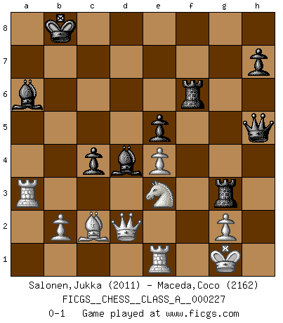 Last move : 0-1 2020 June 24 9:27:4 [Event "FICGS__CHESS__CLASS_A__000227"] [Site "FICGS"] [Date "2020.03.24"] [Round "1"] [White "Salonen,Jukka"] [Black "Maceda,Coco"] [Result "0-1"] [WhiteElo "2011"] [BlackElo "2162"] 1.d4 d5 2.Nf3 Nf6 3.c4 c6 4.Nc3 e6 5.e3 Nbd7 6.Bd3 dxc4 7.Bxc4 b5 8.Bd3 Bb7 9.O-O a6 10.e4 c5 11.d5 Qc7 12.dxe6 fxe6 13.Bc2 c4 14.a3 Bd6 15.Qd2 O-O-O 16.Qe2 Ne5 17.Nxe5 Bxe5 18.h3 Bd4 19.Be3 e5 20.Rfe1 Kb8 21.Rac1 Rd6 22.Nd1 g5 23.a4 Rg8 24.axb5 g4 25.h4 g3 26.bxa6 Ng4 27.fxg3 Nxe3 28.Nxe3 Rxg3 29.Qf2 Qg7 30.Ra1 Rf6 31.Qd2 Qh6 32.Ra3 Bxa6 33.h5 Qxh5 0-1 Queen's pawn game Kingside Castling by player White (move 9) Queenside Castling by player Black (move 15) Player Black won this chess game. Follow this game move after move (download)In Chess, just as in life, today's bliss may be tomorrow's poison. (Assaic) In der Schule lernt man nichts. Es ist nur Zeitverschwendung. (Robert James Fischer) Algunos sacrificios son sólidos, los demás son míos. (Mikhail Tal) On n'a jamais que l'âge auquel on a commence à jouer aux échecs car après on cesse de vieillir. (Capablanca) Real knowledge is to know the extent of one's ignorance. (Confucius)