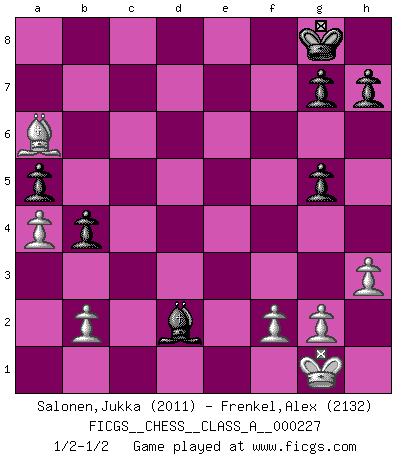 Last move : 1/2-1/2 2020 April 25 8:36:42 [Event "FICGS__CHESS__CLASS_A__000227"] [Site "FICGS"] [Date "2020.03.24"] [Round "1"] [White "Salonen,Jukka"] [Black "Frenkel,Alex"] [Result "1/2-1/2"] [WhiteElo "2011"] [BlackElo "2132"] 1.e4 e5 2.Nf3 Nc6 3.Bb5 a6 4.Ba4 Nf6 5.O-O Be7 6.Re1 b5 7.Bb3 O-O 8.c3 d6 9.h3 Nb8 10.d4 Nbd7 11.Nbd2 Bb7 12.Bc2 c5 13.Nf1 cxd4 14.cxd4 exd4 15.Ng3 Re8 16.Nxd4 d5 17.e5 Bb4 18.Nf3 Ne4 19.Nxe4 dxe4 20.Bg5 f6 21.Rxe4 Nxe5 22.Nxe5 Qxd1+ 23.Rxd1 Bxe4 24.Bxe4 fxg5 25.Bxa8 Rxe5 26.a3 Re1+ 27.Rxe1 Bxe1 28.Bb7 a5 29.Ba6 b4 30.a4 Bd2 1/2-1/2 Ruy Lopez : Closed, 7...O-O Kingside Castling by player White (move 5) Kingside Castling by player Black (move 7) This chess game ended in a draw. Follow this game move after move (download)If your opponent offers you a draw, try to work out why he thinks he's worse off. (Nigel Short) Als er Schachweltmeister wurde ließ er praktisch alle stärksten Sovietspieler für sich arbeiten. Wenn ein auch nur mittelmässiger Meister ein Spezialist für eine bestimmte Eröffnung war, wurde er von Karpov gerufen. Das wurde alles geheim gehalten. (Mikhail Moiseyevich Botvinik) El Ajedrez no es una pizca de inferior al violín, y tenemos un gran número de violinistas profesionales. (Mikhail Botvinnik) La menace est plus forte que l'exécution. (Aaron Nimzovitch) Establishing goals is all right if you don't let them deprive you of interesting detours. (Doug Larson)