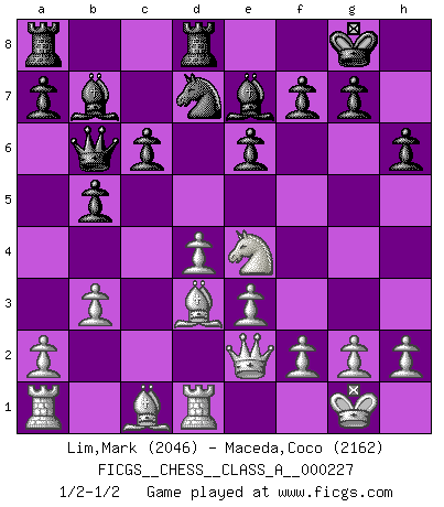 Last move : 1/2-1/2 2020 June 13 5:34:22 [Event "FICGS__CHESS__CLASS_A__000227"] [Site "FICGS"] [Date "2020.03.24"] [Round "1"] [White "Lim,Mark"] [Black "Maceda,Coco"] [Result "1/2-1/2"] [WhiteElo "2046"] [BlackElo "2162"] 1.d4 d5 2.c4 c6 3.Nf3 Nf6 4.Nc3 e6 5.e3 Nbd7 6.Qc2 Bd6 7.Bd3 O-O 8.O-O dxc4 9.Bxc4 b5 10.Bd3 Bb7 11.Ng5 h6 12.Nge4 Be7 13.Rd1 Qb6 14.Qe2 Nxe4 15.Nxe4 Rfd8 16.b3 1/2-1/2 QGD Slav : 4.Nc3 Kingside Castling by player Black (move 7) Kingside Castling by player White (move 8) This chess game ended in a draw. Follow this game move after move (download)The defensive power of a pinned piece is only imaginary. (Aaron Nimzovich) Frage: Wie viele Autos haben Sie schon zerstört? - Antwort: Nur zwei. (Loek van Wely) Personalmente, yo prefiero mirar hacia el futuro en donde un programa de computadora gane el título mundial de Ajedrez. La humanidad necesita una lección de humildad. (Richard Dawkings) Je ne suis pas le dernier à jouer lâchement des coups douteux pendant le zeïtnot de l'adversaire pour l'achever: en effet les coups qui font le plus peur sont ceux que l'on ne comprend pas. Je me fais souvent peur quand je joue. (Un professeur anonyme) Work expands to fill the time available. (C. Northcote Parkinson, in Parkinson's Laws)