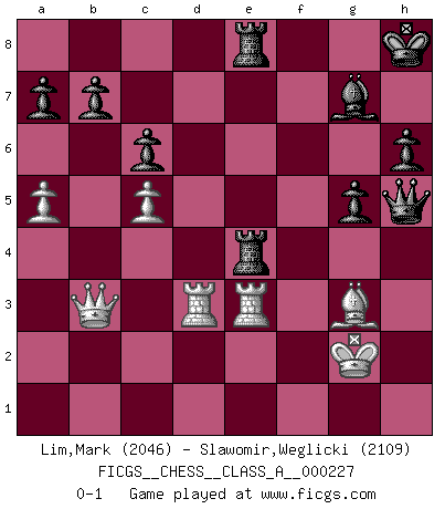 Last move : 0-1 2020 September 8 10:22:23 [Event "FICGS__CHESS__CLASS_A__000227"] [Site "FICGS"] [Date "2020.03.24"] [Round "1"] [White "Lim,Mark"] [Black "Slawomir,Weglicki"] [Result "0-1"] [WhiteElo "2046"] [BlackElo "2109"] 1.d4 f5 2.Nf3 Nf6 3.g3 g6 4.Bg2 Bg7 5.O-O d6 6.c4 O-O 7.Nc3 c6 8.d5 e5 9.dxe6 Bxe6 10.Qd3 Nbd7 11.Bf4 Nb6 12.b3 Re8 13.Rad1 d5 14.Ng5 Qe7 15.Nxe6 dxc4 16.bxc4 Qxe6 17.c5 Nc4 18.Qc2 Qf7 19.Rfe1 Nh5 20.Bd6 Rad8 21.e4 f4 22.e5 Nxe5 23.Ne4 h6 24.a4 fxg3 25.hxg3 Nf3+ 26.Bxf3 Qxf3 27.Re3 Qf5 28.Kg2 Kh8 29.Rde1 Re6 30.Rf3 Qd5 31.Rd3 Qf5 32.f3 Rde8 33.Rde3 Nf6 34.g4 Nxg4 35.fxg4 Qxg4+ 36.Bg3 Qf5 37.Rf3 Qh5 38.a5 Qd5 39.Rd3 Qh5 40.R1e3 R6e7 41.Qc4 g5 42.Qb3 Rxe4 0-1 Dutch Kingside Castling by player White (move 5) Kingside Castling by player Black (move 6) Player Black won this chess game. Follow this game move after move (download)Suddenly it was obvious to me in my analysis I had missed what Fischer had found with the greatest of ease at the board. (Mikhail Botvinnik) Es hat in meinem Leben Zeiten gegeben, in denen das Schachspiel, wenn nicht zum Lebenszweck, so doch zu einem regelrechten Lebensersatz geworden ist. Man fühlt sich in solchen Zeiten nicht so, als besäße man eine göttliche Gabe, sondern eher so, als sei man von ihr besessen. (Garry Kasparov) EL Ajedrez es como la vida. (Boris Spassky) Dieu déplace le joueur, et celui-ci la pièce. Quel Dieu derrière Dieu commence donc la trame ? Arturo Perez-Reverte (prix de littérature policière 1993). All battles are fought by scared men who'd rather be someplace else. (John Wayne in the movie In harm's way)