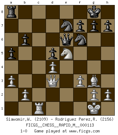 Last move : 1-0 2020 May 25 16:9:9 [Event "FICGS__CHESS__RAPID_M__000113"] [Site "FICGS"] [Date "2020.03.26"] [Round "1"] [White "Slawomir,Weglicki"] [Black "Rodriguez Perez,Rene"] [Result "1-0"] [WhiteElo "2109"] [BlackElo "2156"] 1.d4 e6 2.c4 d5 3.Nf3 Nf6 4.Nc3 Bb4 5.Qa4+ Nc6 6.e3 O-O 7.Qc2 b6 8.Bd2 Ba6 9.Qa4 Bb7 10.cxd5 exd5 11.Bb5 Qd6 12.a3 Bxc3 13.Bxc3 Ne7 14.Rc1 a5 15.O-O Ne4 16.Rfd1 Qe6 17.Be1 c6 18.Bd3 Rfb8 19.Qc2 Ba6 20.Ne5 c5 21.f3 Nf6 22.Bxa6 Rxa6 23.Bg3 Rc8 24.Re1 cxd4 25.Qd3 Rxc1 26.Rxc1 Ra8 27.exd4 1-0 Queen's pawn Kingside Castling by player Black (move 6) Kingside Castling by player White (move 15) Player White won this chess game. Follow this game move after move (download)Chess is a foolish expedient for making idle people believe they are doing something very clever when they are only wasting their time. (George Bernard Shaw) Viele Opfer benötigen überhaupt keine konkrete Berechnung. Es genügt sich die entstehende Position kurz vorzustellen, um uns davon zu überzeugen, dass das Opfer korrekt ist. (Mikhail Nekhemyevich Tal) Mi estilo es algo parecido entre un poco de Tal y Petrosian. (Reshevsky) Les échecs sont un jeu par leur forme, un art par leur essence et une science par sa difficulté d'acquisition. Ils peuvent vous procurer autant de plaisir qu'un bon livre ou une belle musique, mais vous n'aurez une réelle joie que si vous arrivez à bien jouer. (Tigran Petrosian) Wisdom doesn't necessarily come with age. Sometimes age just shows up all by itself. (Tom Wilson)