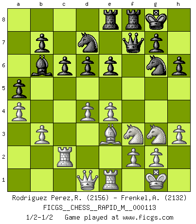 Last move : 1/2-1/2 2020 May 16 1:29:16 [Event "FICGS__CHESS__RAPID_M__000113"] [Site "FICGS"] [Date "2020.03.26"] [Round "1"] [White "Rodriguez Perez,Rene"] [Black "Frenkel,Alex"] [Result "1/2-1/2"] [WhiteElo "2156"] [BlackElo "2132"] 1.e4 e5 2.Nf3 Nc6 3.Bc4 Nf6 4.d3 Bc5 5.h3 h6 6.c3 d6 7.Nbd2 a5 8.O-O O-O 9.Re1 Bd7 10.a4 Be6 11.b3 Ne7 12.Nf1 Ng6 13.Bd2 c6 14.d4 Bb6 15.Bxe6 fxe6 16.Ng3 Nd7 17.Be3 Qe7 18.Ra2 exd4 19.cxd4 Qf7 20.Rc2 Rae8 21.Qb1 Qe7 22.Qd1 Qf7 23.Qb1 Qe7 24.Qd1 Qf7 1/2-1/2 Two knights defense (Modern Bishop's Opening) Kingside Castling by player White (move 8) Kingside Castling by player Black (move 8) This chess game ended in a draw. Follow this game move after move (download)Bobby Fischer is the greatest Chess genius of all time ! (Alexander Kotov) Die Partien sind immer verschieden, die Interviews immer die gleichen. (Garry Kasparov) El hombre es un frívolo, una creatura engañosa y como un jugador de Ajedrez, se preocupa mas por el proceso de obtener su meta que de la meta por sí misma. (Dostoyevsky) Le génie consiste à savoir transgresser les règles au moment opportun. (Teichmann) Perception is reality. (Immanuel Kant)