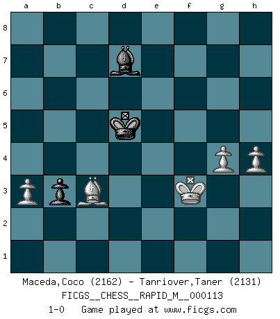 Last move : 1-0 2020 September 24 3:37:31 [Event "FICGS__CHESS__RAPID_M__000113"] [Site "FICGS"] [Date "2020.03.26"] [Round "1"] [White "Maceda,Coco"] [Black "Tanriover,Taner"] [Result "1-0"] [WhiteElo "2162"] [BlackElo "2131"] 1.e4 e5 2.Nf3 Nc6 3.Bc4 Nf6 4.d3 Bc5 5.c3 O-O 6.O-O d6 7.h3 h6 8.Re1 a5 9.Nbd2 Be6 10.a4 Qd7 11.Bb5 Qd8 12.Nf1 Na7 13.d4 exd4 14.Nxd4 Nxb5 15.axb5 Re8 16.Ng3 Bd7 17.Qd3 a4 18.Bd2 a3 19.bxa3 Ra4 20.Bc1 b6 21.Nb3 Be6 22.Nxc5 dxc5 23.Qc2 Qa8 24.f3 Rd8 25.Bb2 Qa5 26.Rad1 Rxd1 27.Rxd1 Qxb5 28.c4 Rxc4 29.Rd8+ Ne8 30.Qd2 Kh7 31.Nf5 f6 32.Ne3 Nd6 33.e5 Nf7 34.exf6 Rd4 35.Bxd4 Nxd8 36.Bb2 Qd7 37.Qxd7 Bxd7 38.fxg7 Be6 39.Be5 b5 40.Bxc7 Nc6 41.Bd6 b4 42.Bxc5 b3 43.Nd1 Kxg7 44.Kf2 h5 45.g4 hxg4 46.fxg4 Bd7 47.Bb4 Kf7 48.Bc3 Ne7 49.Ne3 Ke6 50.h4 Nd5 51.Nxd5 Kxd5 52.Kf3 1-0 Two knights defense (Modern Bishop's Opening) Kingside Castling by player Black (move 5) Kingside Castling by player White (move 6) 10 pieces endgame at move 46 : White KBNPPP , Black KBNP WHITE : King + 1 Bishop 1 Knight 3 Pawns BLACK : King + 1 Bishop 1 Knight 1 Pawn 9 pieces endgame at move 51 : White KBNPPP , Black KBP WHITE : King + 1 Bishop 1 Knight 3 Pawns BLACK : King + 1 Bishop 1 Pawn 8 pieces endgame at move 51 : White KBPPP , Black KBP WHITE : King + 1 Bishop 3 Pawns BLACK : King + 1 Bishop 1 Pawn Player White won this chess game. Follow this game move after move (download)We don't really know how the game was invented, though there are suspicions. As soon as we discover the culprits, we'll let you know. (Bruce Pandolfini) Bobby Fischer ist kein Vorbild für die heutige Jugend. (Viktor Kortschnoi) Fischer es una tragedia del Ajedrez Americano a la par con Morphy y Pillsbury. (Mig Greengard) Si rien de grave n'est détecté lors de l'analyse d'une position, on joue alors le coup. Seconde règle de Blumenfeld. Convictions are more dangerous enemies of truth than lies. (Friedrich Nietzsche)