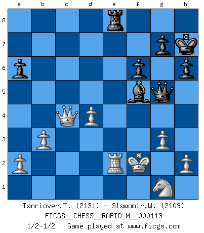 Last move : 1/2-1/2 2020 June 23 6:59:2 [Event "FICGS__CHESS__RAPID_M__000113"] [Site "FICGS"] [Date "2020.03.26"] [Round "1"] [White "Tanriover,Taner"] [Black "Slawomir,Weglicki"] [Result "1/2-1/2"] [WhiteElo "2131"] [BlackElo "2109"] 1.e4 c5 2.f4 e6 3.Nf3 Nc6 4.Bb5 Nge7 5.O-O a6 6.Be2 d5 7.d3 Ng6 8.c3 Be7 9.g3 f6 10.Be3 O-O 11.Qc2 Nh8 12.d4 cxd4 13.Nxd4 e5 14.fxe5 Nxe5 15.Nd2 Nhf7 16.Qb3 Bc5 17.exd5 b5 18.Ne4 Bxd4 19.cxd4 Nc4 20.Bf4 Qxd5 21.Rad1 Re8 22.Nc3 Qd8 23.Bxc4 bxc4 24.Qxc4 Bg4 25.Rde1 Bh3 26.Rxe8+ Qxe8 27.Rc1 Rb8 28.b3 Rc8 29.Qd3 h6 30.Kf2 Qd7 31.Ne2 Re8 32.Rc7 Qd5 33.Qf3 Qf5 34.Ng1 Ng5 35.Bxg5 Qxg5 36.Rc2 Bg4 37.Qd3 Bf5 38.Qc4+ Kh7 39.Re2 1/2-1/2 Sicilian : Grand Prix attack Kingside Castling by player White (move 5) Kingside Castling by player Black (move 10) This chess game ended in a draw. Follow this game move after move (download)I guess a certain amount of temperament is expected of Chess geniuses. (Ron Gross) Gewöhnliche Menschen denken nur daran, wie sie ihre Zeit verbringen. Ein intelligenter Mensch versucht, sie auszunutzen. (Arthur Schopenhauer) En el Ajedrez, tal como es jugado por los Maestros, practicamente la suerte es eliminada. (Emanuel Lasker) Le jeu d'échecs fait naître et fortifie en nous plusieurs qualités précieuses dans le cours de l'existence, telles que la prévoyance, la circonspection, la prudence, et la persévérance. (Benjamin Franklin - 1783, la morale des échecs) I can't decide which is riskier; taking crazy risks, or taking advice on crazy risks from a crazy risk taker. (Gregory House in House M.D.)