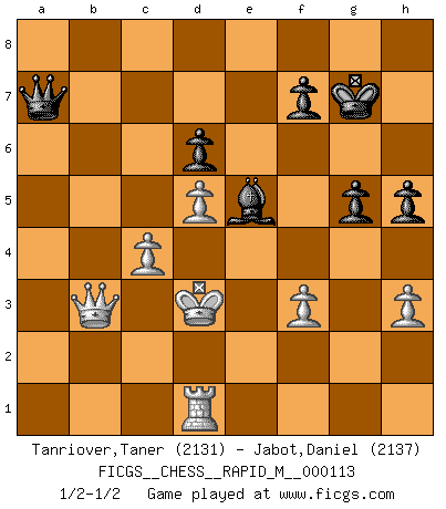 Last move : 1/2-1/2 2020 September 8 1:21:0 [Event "FICGS__CHESS__RAPID_M__000113"] [Site "FICGS"] [Date "2020.03.26"] [Round "1"] [White "Tanriover,Taner"] [Black "Jabot,Daniel"] [Result "1/2-1/2"] [WhiteElo "2131"] [BlackElo "2137"] 1.e4 c5 2.Nf3 d6 3.Nc3 Nf6 4.d4 cxd4 5.Nxd4 Nc6 6.Bg5 Qb6 7.Nb3 e6 8.Bf4 e5 9.Be3 Qd8 10.f3 Be7 11.Qd2 O-O 12.O-O-O a5 13.Bb5 Na7 14.Bd3 Bd7 15.Qf2 Qb8 16.g4 a4 17.g5 Nh5 18.Nd5 Nc6 19.Nd2 a3 20.Nc4 axb2+ 21.Kxb2 Nf4 22.Ncb6 Nxd5 23.exd5 Nd4 24.Bxd4 exd4 25.Qxd4 Qa7 26.Bc4 Qa3+ 27.Kb1 Bf5 28.Nxa8 Rxa8 29.Qb2 Qc5 30.Qb5 Qf2 31.Bd3 Bxd3 32.Rxd3 Rc8 33.Qb2 Bxg5 34.c4 Qa7 35.Rb3 Bf6 36.Rxb7 Qc5 37.Qb3 g5 38.Rb8 Rxb8 39.Qxb8+ Kg7 40.Qb3 Qf2 41.a4 h5 42.a5 Qd4 43.Rd1 Qa1+ 44.Kc2 Qxa5 45.Kd3 Be5 46.h3 Qa7 1/2-1/2 Sicilian Kingside Castling by player Black (move 11) Queenside Castling by player White (move 12) This chess game ended in a draw. Follow this game move after move (download)When asked, -How is that you pick better moves than your opponents?, I responded: I'm very glad you asked me that, because, as it happens, there is a very simple answer. I think up my own moves, and I make my opponent think up his. (Alexander Alekhine) Wenn Dein Gegner dir ein Remis anbietet, versuch herauszufinden, weshalb er glaubt schlechter zu stehen. (Nigel Short) El Ajedrez es tan inspirador que yo no creo que un buen jugador sea capaz de tener un pensamiento malo durante una partida. (Wilhelm Steinitz) Le joueur d'Echecs qui veut atteindre le top est obligé de développer son propre credo créatif. Alexeï Stepanovicth Souétine. Il est facile d'écrire des livres ! Ce qui est difficile, c'est de jouer ! (Alexeï Stepanovicth Souétine) The only difference between a tax man and a taxidermist is that the taxidermist leaves the skin. (Mark Twain)