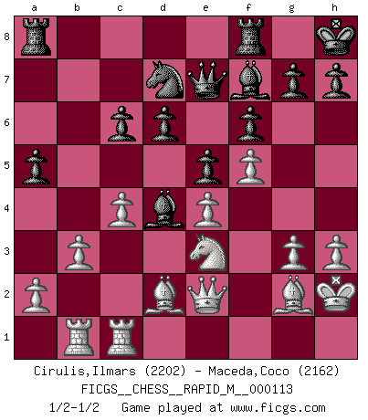 Last move : 1/2-1/2 2020 June 19 0:21:44 [Event "FICGS__CHESS__RAPID_M__000113"] [Site "FICGS"] [Date "2020.03.26"] [Round "1"] [White "Cirulis,Ilmars"] [Black "Maceda,Coco"] [Result "1/2-1/2"] [WhiteElo "2202"] [BlackElo "2162"] 1.c4 e5 2.Nc3 Nf6 3.e4 Bc5 4.g3 d6 5.h3 O-O 6.Bg2 a6 7.d3 Be6 8.Nge2 b5 9.b3 bxc4 10.dxc4 Nfd7 11.O-O a5 12.Na4 Ba7 13.Kh2 f6 14.Rb1 Nc6 15.Nac3 Nd4 16.f4 Kh8 17.f5 Bf7 18.Be3 Nxe2 19.Qxe2 Qe7 20.Nd5 Qd8 21.Bd2 Bd4 22.Rfc1 c6 23.Ne3 Qe7 1/2-1/2 English Opening Kingside Castling by player Black (move 5) Kingside Castling by player White (move 11) This chess game ended in a draw. Follow this game move after move (download)Daring ideas are like Chess men moved forward. They may be beaten, but they may start a winning game. (Johann Wolfgang von Goethe) Nur ein wirklich starker Spieler weiß wie schwach er spielt. (Savielly Grigorievitsch Tartakower) Con el fin de mejorar tu juego, debes de estudiar los finales antes que todo, ya que mientras que los finales pueden ser estudiados y dominados por sí mismos, el juegomedio y la apertura deben de ser estudiados en relación con los finales. (José Raúl Capablanca) Les Echecs mettent en conflit, non pas deux intelligences, mais deux volontés. (Lasker) If computers get too powerful, we can organize them into committees. That'll do them in. (Anonymous)