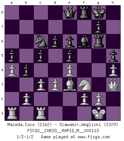 Last move : 1/2-1/2 2020 May 24 8:30:31 [Event "FICGS__CHESS__RAPID_M__000113"] [Site "FICGS"] [Date "2020.03.26"] [Round "1"] [White "Maceda,Coco"] [Black "Slawomir,Weglicki"] [Result "1/2-1/2"] [WhiteElo "2162"] [BlackElo "2109"] 1.e4 e5 2.Nf3 Nc6 3.Bb5 a6 4.Ba4 Nf6 5.O-O Be7 6.Re1 b5 7.Bb3 O-O 8.a4 b4 9.h3 d6 10.d3 Na5 11.Ba2 c5 12.Nbd2 Be6 13.Nc4 Nxc4 14.Bxc4 a5 15.Qe2 Nd7 16.Bxe6 fxe6 17.Be3 Qe8 18.Nd2 Nb8 19.Qg4 Rf6 20.h4 Nc6 21.c3 h5 22.Qg3 Qf7 23.Bg5 Rg6 24.Nf3 Rf8 25.Rec1 Bf6 26.Qh2 Qe7 27.Qh3 Qe8 28.Be3 1/2-1/2 Ruy Lopez : Closed, 7...O-O Kingside Castling by player White (move 5) Kingside Castling by player Black (move 7) This chess game ended in a draw. Follow this game move after move (download)With or without the title, Bobby Fischer was unquestionably the greatest player of his time. (Burt Hochberg) Konzentriere dich auf materielle Gewinne. Nimm, was dir dein Gegner gibt, ausser es gibt einen guten Grund der dagegenspricht. (Robert James Fischer) Los libros de Ajedrez deben de usarse igual como usamos los anteojos: para mejorar la vista, aunque algunos jugadores los quieren usar como si ellos les otorgaran la vision. (José Raúl Capablanca) Pour se monter efficace, un Cavalier a besoin d'avant-postes ! Les Cavaliers font les meilleurs bloqueurs de pions passés. The various flowers seem good to different people. (Chinese proverb)