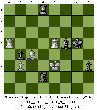 Last move : 1-0 2020 April 13 22:42:17 [Event "FICGS__CHESS__RAPID_M__000113"] [Site "FICGS"] [Date "2020.03.26"] [Round "1"] [White "Slawomir,Weglicki"] [Black "Frenkel,Alex"] [Result "1-0"] [WhiteElo "2109"] [BlackElo "2132"] 1.e4 e5 2.Nf3 Nc6 3.Bb5 a6 4.Ba4 Nf6 5.O-O Be7 6.Re1 b5 7.Bb3 O-O 8.c3 d6 9.h3 Nb8 10.d4 Nbd7 11.Nbd2 Bb7 12.Bc2 c5 13.d5 c4 14.b3 cxb3 15.axb3 Qc7 16.Nb1 Rfc8 17.Bd2 Nb6 18.Nh4 Nfxd5 19.exd5 Bxh4 20.Qh5 Bxf2+ 21.Kxf2 g6 22.Qh4 Nxd5 23.Kg1 f5 24.c4 Qc6 25.Qg3 Rf8 26.Bd3 Qc5+ 27.Qf2 Nb4 28.Qxc5 dxc5 29.Bxb4 cxb4 30.Rxe5 Rfd8 31.Bf1 bxc4 32.Bxc4+ Kf8 33.Re1 Rd4 34.Ra2 Rad8 35.Kf2 Be4 36.Be2 g5 37.Rxa6 Kg7 38.Ra2 g4 39.hxg4 fxg4 40.Bc4 Bg6 41.Kg3 h5 42.Re7+ Kf6 43.Re6+ Kg5 44.Ra5+ Bf5 45.Kf2 h4 46.Ke3 h3 47.gxh3 gxh3 48.Nd2 Rxd2 49.R6e5 1-0 Ruy Lopez : Closed, 7...O-O Kingside Castling by player White (move 5) Kingside Castling by player Black (move 7) Player White won this chess game. Follow this game move after move (download)A thorough understanding of the typical mating continuations makes the most complicated sacrificial combinations leading up to them not only not difficult, but almost a matter of course. (Siegbert Tarrasch) Ich habe Putins Aufstieg an die Macht beobachtet und seine Politik, die demokratischen Institutionen meines Landes zu zerstören. (Garry Kasparov) El Ajedrez es un mar en el cual un mosquito puede beber y un elefante puede bañarse. (Refrán Hindú) Ne tendez aucun piège pour le plaisir ! Ne jouez rien dans l'espoir que l'adversaire réagisse de façon stupide ! Prenez toujours pour acquis que l'adversaire va trouver le meilleur coup ! Ne jouez jamais de coup dans l'espoir que l'adversaire ne voie pas la menace ! Chacun de vos coups doit améliorer la position d'une façon ou d'une autre. Whenever people agree with me, I always feel I must be wrong. (Oscar Wilde)