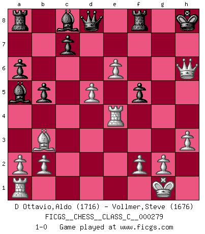 Last move : 1-0 2020 May 1 16:58:18 [Event "FICGS__CHESS__CLASS_C__000279"] [Site "FICGS"] [Date "2020.03.28"] [Round "1"] [White "D Ottavio,Aldo"] [Black "Vollmer,Steve"] [Result "1-0"] [WhiteElo "1716"] [BlackElo "1676"] 1.e4 e5 2.Nf3 Nc6 3.Bb5 a6 4.Ba4 Nf6 5.O-O b5 6.Bb3 Be7 7.Re1 O-O 8.c3 Bb7 9.d4 d6 10.h3 h6 11.Nbd2 exd4 12.Nxd4 Nxd4 13.cxd4 d5 14.e5 Ne4 15.Nxe4 dxe4 16.d5 Bb4 17.Rxe4 Ba5 18.Bxh6 gxh6 19.Qh5 Bc8 20.e6 f5 21.Qg6+ Kh8 22.Qxh6+ 1-0 Ruy Lopez : 5.O-O Kingside Castling by player White (move 5) Kingside Castling by player Black (move 7) Player White won this chess game. Follow this game move after move (download)With or without the title, Bobby Fischer was unquestionably the greatest player of his time. (Burt Hochberg) Heutzutage gewinnt im Turnier nicht derjenige Spieler, der weitreichende Pläne entwirft, sondern einfach jener, der Zug um Zug kämpft. (David Bronstein) Yo no le temo a Spassky. Todos saben que yo soy el mejor. Uno no necesita un torneo para probarlo. (Bobby Fischer) Les échecs, c'est l'imagination. (David Bronstein) Every man's memory is his private literature. (Aldous Huxley)