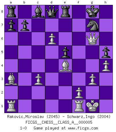 Last move : 1-0 2006 July 20 20:29:40 [Event "FICGS__CHESS__CLASS_A__000005"] [Site "FICGS"] [Date "2006.06.20"] [Round "1"] [White "Rakovic,Miroslav"] [Black "Schwarz,Ingo"] [Result "1-0"] [WhiteElo "2045"] [BlackElo "2004"] 1.c4 g6 2.g3 Bg7 3.Bg2 c5 4.Nc3 Nc6 5.a3 e6 6.b4 cxb4 7.axb4 Nxb4 8.Ba3 Bxc3 9.dxc3 Nc6 10.Nf3 Nge7 11.h4 h5 12.O-O O-O 13.Qd2 Re8 14.e4 d5 15.Qh6 f6 16.cxd5 exd5 17.exd5 Ne5 18.Nxe5 fxe5 19.d6 Nf5 20.Qxg6+ Ng7 21.Be4 1-0 English Opening Kingside Castling by player White (move 12) Kingside Castling by player Black (move 12) Player White won this chess game. Follow this game move after move (download)Chess is life. (Bobby Fischer) Wenn Schach ein enormer Dschungel ist, der seine Myriaden von Geheimnissen nicht preisgeben will, dann sind Computer die Kettensägen einer gewaltigen ökologisch unsensiblen Nutzholzfirma. (Nigel Short) Antes de los Finales, los dioses han colocado el Juego Medio. (Siegbert Tarrasch) Shah mat. Le roi est mort. Cri de fierté d'un joueur venant de terrasser son adversaire, courtoisement, sans effusion de sang. A good book on your shelf is a friend that turns its back on you and remains a friend. (Author unknown)