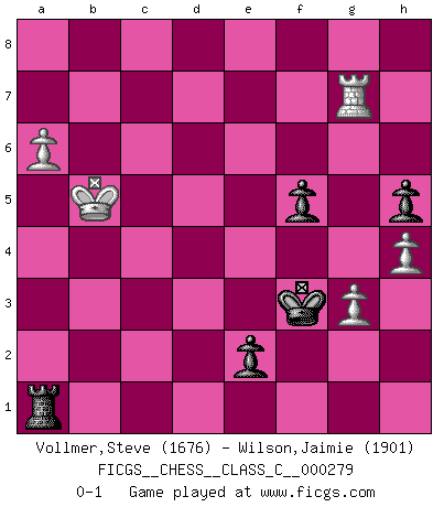 Last move : 0-1 2021 January 23 11:54:11 [Event "FICGS__CHESS__CLASS_C__000279"] [Site "FICGS"] [Date "2020.03.28"] [Round "1"] [White "Vollmer,Steve"] [Black "Wilson,Jaimie"] [Result "0-1"] [WhiteElo "1676"] [BlackElo "1901"] 1.e4 c5 2.Nf3 e6 3.c4 Nc6 4.d4 cxd4 5.Nxd4 Nf6 6.Nc3 Bb4 7.Nxc6 bxc6 8.Bd3 e5 9.O-O h6 10.Bd2 O-O 11.a3 Bc5 12.b4 Be7 13.c5 d6 14.cxd6 Qxd6 15.Be3 Be6 16.Bc5 Qc7 17.Bxe7 Qxe7 18.Na4 Nd7 19.Ba6 c5 20.bxc5 Nxc5 21.Nxc5 Qxc5 22.Qe2 Rab8 23.Bd3 Rfc8 24.Rfe1 Rb3 25.a4 a5 26.Bb5 Rc3 27.Rad1 Bc4 28.Bxc4 Qxc4 29.Qxc4 R3xc4 30.Rd5 R8c5 31.Rxc5 Rxc5 32.f3 f6 33.Kf2 Rc4 34.Ra1 Kf7 35.Ra2 Ke6 36.Ke3 Kd6 37.g3 Kc5 38.Kd3 Rd4+ 39.Kc3 h5 40.h4 Rd1 41.Rb2 Rf1 42.Rb5+ Kc6 43.Rxa5 Rxf3+ 44.Kb4 Re3 45.Rc5+ Kd6 46.Rd5+ Ke6 47.a5 Rxe4+ 48.Kc5 Ra4 49.Kc6 e4 50.Rd6+ Kf5 51.Rd5+ Kg4 52.Kb5 Ra1 53.Rd4 f5 54.Rd7 e3 55.Rxg7+ Kf3 56.a6 e2 0-1 Follow this game move after move (download)Half the variations which are calculated in a tournament game turn out to be completely superfluous. Unfortunately, no one knows in advance which half. (Jan Tinman) Deine Wertungszahl - vorausgesetzt einige Jahre schachliche Anstrengung - entspricht etwa dem zehnfachen Deines IQ plus 1000. (Jonathan Levitt) Siempre es mejor sacrificar los hombres de tu oponente. (Savielly Tartakower) Toute estimation doit être constamment réévaluée. (Jacob Estrin) The age of a woman doesn't mean a thing. The best tunes are played on the oldest fiddles. (Ralph Waldo Emerson)
