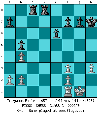 Last move : 0-1 2020 May 4 10:14:14 [Event "FICGS__CHESS__CLASS_C__000279"] [Site "FICGS"] [Date "2020.03.28"] [Round "1"] [White "Trigance,Emile"] [Black "Vellema,Jelle"] [Result "0-1"] [WhiteElo "1657"] [BlackElo "1878"] 1.e4 e6 2.d4 d5 3.Nc3 dxe4 4.Nxe4 Nd7 5.Nf3 Ngf6 6.Nxf6+ Nxf6 7.Bd3 c5 8.O-O Be7 9.Bf4 O-O 10.h3 b6 11.c3 Bb7 12.Be3 Qc7 13.dxc5 Bxc5 14.Bxc5 Qxc5 15.Qe2 Rfd8 16.Rad1 Nh5 17.Be4 Ng3 18.Bxh7+ Kxh7 19.Qc2+ Be4 20.Qa4 b5 21.Qb4 Qxb4 22.cxb4 Nxf1 23.Rxf1 Bxf3 24.gxf3 Rac8 0-1 French : Rubinstein variation Kingside Castling by player White (move 8) Kingside Castling by player Black (move 9) Player Black won this chess game. Follow this game move after move (download)The tactician must know what to do whenever something needs doing; the strategist must know what to do when nothing needs doing. (Savielly Tartakover) Sie führen leise Selbstgespräche, schlürfen lautstark ihre Getränke, schmatzen hörbar beim Essen, blasen ihrem Gegenüber Rauch in die Augen, niesen ihm ins Gesicht, starren ihn unverwandt an, bis er sich unter ihren Blicken windet, rutschen ständig auf ihrem Stuhl hin und her, rülpsen und bohren in der Nase. (Anonymous) Es muy difícil jugar en contra de la teoría de Einstein. - en su primera derrota en contra de Fischer (Mikhail Tal) Les erreurs sont comme les malheurs, elles n'arrivent jamais seules. (Siegbert Tarrasch) When you don't know what to do, walk fast and look worried. (Anonymous)