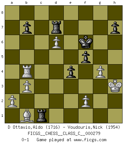 Last move : 0-1 2020 June 4 19:40:0 [Event "FICGS__CHESS__CLASS_C__000279"] [Site "FICGS"] [Date "2020.03.28"] [Round "1"] [White "D Ottavio,Aldo"] [Black "Voudouris,Nick"] [Result "0-1"] [WhiteElo "1716"] [BlackElo "1954"] 1.e4 Nf6 2.e5 Nd5 3.d4 d6 4.Nf3 dxe5 5.Nxe5 g6 6.c4 Nb6 7.Nc3 Bg7 8.Be3 c5 9.dxc5 Qxd1+ 10.Rxd1 Bxe5 11.cxb6 axb6 12.Bd4 Bxd4 13.Rxd4 e5 14.Rd2 Be6 15.Be2 Nc6 16.O-O Nd4 17.Rfd1 Ke7 18.b3 g5 19.Bd3 f5 20.Nd5+ Bxd5 21.cxd5 b5 22.d6+ Kf6 23.Bb1 Rad8 24.g3 Nf3+ 25.Kg2 Nxd2 26.Rxd2 Rd7 27.Rd5 b4 28.Rb5 g4 29.Rxb4 e4 30.h3 gxh3+ 31.Kxh3 Rc8 32.g4 Rc1 0-1 Alekhine's defense : Modern, Larsen variation Kingside Castling by player White (move 16) Player Black won this chess game. Follow this game move after move (download)By playing at Chess then, we may learn: First: Foresight... Second: Circumspection... Third: Caution... And lastly, we learn by Chess the habit of not being discouraged by present bad appearances in the state of our affairs, the habit of hoping for a favorable chance, and that of persevering in the secrets of resources. (Benjamin Franklin) Karpov ist ein Museumsstück. (Garry Kasparov) Desconfianza es la característica mas necesaria de un jugador de Ajedrez. (Siegbert Tarrasch) Nous vivons dans un monde échiquéen : chaque jour qui passe est un défi à relever. (Philosophe Sasha) The only thing that matters is the evidence. (Horatio Caine, C.S.I. Miami)