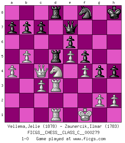 Last move : 1-0 2020 September 13 4:34:55 [Event "FICGS__CHESS__CLASS_C__000279"] [Site "FICGS"] [Date "2020.03.28"] [Round "1"] [White "Vellema,Jelle"] [Black "Zaunercik,Ilmar"] [Result "1-0"] [WhiteElo "1878"] [BlackElo "1783"] 1.d4 d5 2.Nf3 Nf6 3.e3 e6 4.Bd3 Nc6 5.Nbd2 Be7 6.O-O O-O 7.c3 Re8 8.e4 dxe4 9.Nxe4 Bd7 10.Qe2 Nxe4 11.Qxe4 f5 12.Qe2 Bf6 13.Bf4 g5 14.Be5 g4 15.Nd2 Bxe5 16.dxe5 Ne7 17.Bc4 Ng6 18.Rad1 Qh4 19.f4 Bc6 20.Nb3 Nf8 21.Rd2 Rad8 22.Nd4 Be4 23.Bd3 Bxd3 24.Rxd3 h5 25.b4 Rd7 26.a4 Qe7 27.Qa2 Kh8 28.Qc4 h4 29.Rfd1 Red8 30.b5 Rd5 31.Kf1 1-0 Queen's pawn game Kingside Castling by player White (move 6) Kingside Castling by player Black (move 6) Player White won this chess game. Follow this game move after move (download)In Fischer's hands, a slight theoretical advantage is as good a being a Queen ahead. (Isaac Kashdan) Der Umstand, daß uns eine 7 Stunden Zeitkontrolle ermöglicht eine großartige, tiefe Partie zu spielen, ist für die Massenmedien nicht weiter von Bedeutung. (Alexej Shirov) Al jugar al Ajedrez entonces, podemos aprender: Primero: Previsión... Segundo: Prudencia... Tercero: Cautela... Y al final, aprendemos del Ajedrez el hábito de no ser desanimados por apariencias malas presentes en el estado de nuestros asuntos, el hábito de la esperanza por una oportunidad favorable y la perseveración de los secretos de los recursos. (Benjamin Franklin) Il vaut toujours mieux jouer un plan faux de façon logique que de n'avoir pas de plan du tout. (Victor Kortchnoï) The question of whether computers can think is just like question of whether submarines can swim. (Edsger W. Dijkstra)