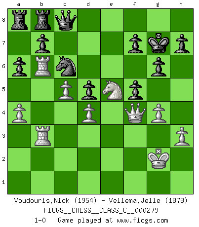 Last move : 1-0 2020 July 21 18:37:22 [Event "FICGS__CHESS__CLASS_C__000279"] [Site "FICGS"] [Date "2020.03.28"] [Round "1"] [White "Voudouris,Nick"] [Black "Vellema,Jelle"] [Result "1-0"] [WhiteElo "1954"] [BlackElo "1878"] 1.d4 Nf6 2.f4 d5 3.e3 Bf5 4.Bd3 Bxd3 5.Qxd3 c5 6.Nf3 e6 7.O-O Nc6 8.b3 Be7 9.c4 O-O 10.Bb2 Rc8 11.Nbd2 a6 12.Rac1 cxd4 13.exd4 Bb4 14.c5 Bxd2 15.Nxd2 Ne7 16.Qe2 Qc7 17.Rf3 g6 18.b4 Qd7 19.Rb3 Nf5 20.g4 Ne7 21.h3 Ne8 22.Kg2 Nc7 23.a4 Ra8 24.Ra3 Nc6 25.Rb1 Rfb8 26.Nf3 Nxb4 27.Ne5 Qe8 28.Bc3 Nc6 29.Rb6 Qc8 30.Rab3 Nd8 31.f5 exf5 32.Bd2 Nce6 33.Qf2 Ng7 34.Bh6 Nc6 35.Bxg7 Kxg7 36.Qf4 1-0 Canard Opening Kingside Castling by player White (move 7) Kingside Castling by player Black (move 9) Player White won this chess game. Follow this game move after move (download)Every Pawn is a potential Queen. (James Mason) Schon mancher Spieler hat aufgegeben, um zu vermeiden, daß er eine Figur verliert. (Savielly Grigorievitsch Tartakower) Sin errores no puede haber brillantez. (Emanuel Lasker) 'L'échange des dames est un coup dur pour les deux adversaires...' Un journaliste lors d'une partie du match Spassky-Fischer Empty your mind, be formless, shapeless — like water. (Bruce Lee)