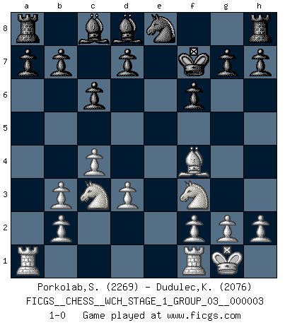 Last move : 1-0 2007 September 30 4:37:9 [Event "FICGS__CHESS__WCH_STAGE_1_GROUP_03__000003"] [Site "FICGS"] [Date "2007.07.11"] [Round "1"] [White "Porkolab,Sandor"] [Black "Dudulec,Konstantin"] [Result "1-0"] [WhiteElo "2269"] [BlackElo "2076"] 1.Nc3 e5 2.e4 Nf6 3.Bc4 Nxe4 4.Qh5 Nd6 5.Qxe5+ Qe7 6.Qxe7+ Bxe7 7.Bb3 Nc6 8.Nf3 Na5 9.O-O Nxb3 10.axb3 f6 11.d3 Kf7 12.Nd5 Bd8 13.Bf4 Ne8 14.c4 c6 15.Nc3 1-0 This chess game has been lost on time (started : 2007.07.11 16:52:5) Dunst (Sleipner-Heinrichsen) Opening Kingside Castling by player White (move 9) Player White won this chess game. Follow this game move after move (download)All that matters on the Chessboard is good moves. (Bobby Fischer) Viele Opfer benötigen überhaupt keine konkrete Berechnung. Es genügt sich die entstehende Position kurz vorzustellen, um uns davon zu überzeugen, dass das Opfer korrekt ist. (Mikhail Nekhemyevich Tal) Las Aperturas te enseñan aperturas. ¡Los Finales te enseñan Ajedrez!. (Stephan Gerzadowicz) Le plus grand jeu de l'esprit jamais inventé, plus vous l'apprenez, plus vous y prenez du plaisir. (Garry Kasparov) If you ain't just a little scared when you enter a casino, you are either very rich or you haven't studied the games enough. (Pappy)
