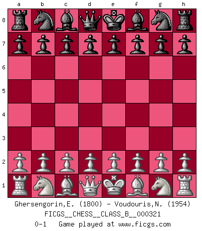 Last move : 0-1 2020 May 7 21:39:30 [Event "FICGS__CHESS__CLASS_B__000321"] [Site "FICGS"] [Date "2020.03.28"] [Round "1"] [White "Ghersengorin,Eric"] [Black "Voudouris,Nick"] [Result "0-1"] [WhiteElo "1800"] [BlackElo "1954"] 0-1 This chess game has been lost on time (started : 2020.03.28 12:40:26) Player Black won this chess game. Follow this game move after move (download)No one ever won a game by resigning. (Unknown) Die FIDE ist dabei in die Hände der russischen Mafia zu fallen. (Larry Evans) No es tiempo de jugar al Ajedrez cuando la casa esta en llamas. (Proverbio Italiano) Les sacrifices démontrent seulement que quelqu'un a gaffé. (Savielly Tartacover) You can only get smarter by playing a smarter opponent. (Revolver, movie)