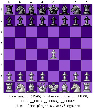 Last move : 1-0 2020 May 7 21:39:30 [Event "FICGS__CHESS__CLASS_B__000321"] [Site "FICGS"] [Date "2020.03.28"] [Round "1"] [White "Gossmann,Ewald"] [Black "Ghersengorin,Eric"] [Result "1-0"] [WhiteElo "1946"] [BlackElo "1800"] 1.e4 1-0 This chess game has been lost on time (started : 2020.03.28 12:40:26) King's pawn Opening Player White won this chess game. Follow this game move after move (download)You can only get good at Chess if you love the game. (Bobby Fischer) Im Schach gewinnt jeder. Hat man Freunde am Spiel - und das ist die Hauptsache - ist auch der Verlust einer Partie kein Unglück. (David Bronstein) Mis oponentes también hacen buenas movidas. A veces yo no tomo esas cosas en consideración. (Bobby Fischer) Votre prénom est 'Tactique', votre deuxième prénom est 'Tactique' et votre nom est 'Tactique'. (Ken Smith) The message for business people contemplating their place in the cyberspace is simple and direct: get linked or get lost. (Vic Sussman and Kenan Pollack)