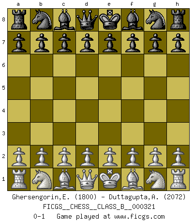 Last move : 0-1 2020 May 7 21:39:30 [Event "FICGS__CHESS__CLASS_B__000321"] [Site "FICGS"] [Date "2020.03.28"] [Round "1"] [White "Ghersengorin,Eric"] [Black "Duttagupta,Aniruddha"] [Result "0-1"] [WhiteElo "1800"] [BlackElo "2072"] 0-1 This chess game has been lost on time (started : 2020.03.28 12:40:26) Player Black won this chess game. Follow this game move after move (download)Only sissies Castle. (Rob Sillars) Ich könnte leicht behaupten: Ja,ja, Leonid Breschnew wollte nicht, daß ich Weltmeister werde. In der Tat war die Sache komplizierter. (Viktor Kortschnoi) Diferente gente reacciona diferentemente en aceptar la derrota. (Bobby Fischer) Mais l'homme est une créature légère et illogique : semblable au joueur d'échecs, il n'aime que le processus du but à atteindre, non le but lui-même. (Dostoïevsky) Nobody is always a winner, and anybody who says he is, is either a liar or doesn't play poker. (Amarillo Slim)