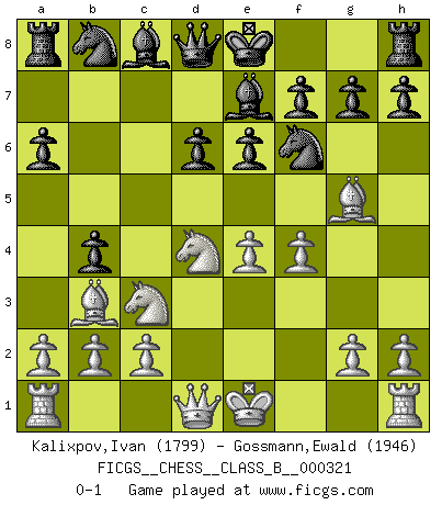 Last move : 0-1 2020 May 8 9:41:39 [Event "FICGS__CHESS__CLASS_B__000321"] [Site "FICGS"] [Date "2020.03.28"] [Round "1"] [White "Kalixpov,Ivan"] [Black "Gossmann,Ewald"] [Result "0-1"] [WhiteElo "1799"] [BlackElo "1946"] 1.e4 c5 2.Nf3 d6 3.d4 cxd4 4.Nxd4 Nf6 5.Nc3 a6 6.Bg5 e6 7.Bc4 b5 8.Bb3 Be7 9.f4 b4 0-1 This chess game has been lost on time (started : 2020.03.28 12:40:26) Sicilian : Najdorf, 6...e6 Player Black won this chess game. Follow this game move after move (download)The passed Pawn is a criminal, who should be kept under lock and key. Mild measures, such as police surveillance, are not sufficient. (Aaron Nimzovich) Der vorletzte Fehler gewinnt. (Savielly Grigorievitsch Tartakower) El Ajedrez es el juego mas altamente simbólico, pero las agresiones estan por lo tanto aún mas francamente representadas en la partida. Tal vez comenzo como un juego de guerra; Algo como la representación de una batalla en miniatura entre las fuerzas de dos reinos. (Karl Meninger) Le jeu d'échecs est comme rejeté hors du temps. (Antoine de Saint-Exupéry) If you lose the game you should win the analysis! (Proverb)