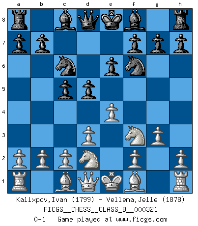 Last move : 0-1 2020 May 11 5:12:47 [Event "FICGS__CHESS__CLASS_B__000321"] [Site "FICGS"] [Date "2020.03.28"] [Round "1"] [White "Kalixpov,Ivan"] [Black "Vellema,Jelle"] [Result "0-1"] [WhiteElo "1799"] [BlackElo "1878"] 1.e4 e6 2.d3 c5 3.Nf3 d5 4.Nbd2 Nc6 5.g3 Nf6 0-1 This chess game has been lost on time (started : 2020.03.28 12:40:26) French : King's Indian attack Player Black won this chess game. Follow this game move after move (download)A man that will take back a move at Chess will pick a pocket. (Richard Fenton) Schach ist ein Reich, wo sich die menschliche Phantasie frei entfalten kann. (David Bronstein) Si no le temes a Spassky, entonces elimino el elemento del dinero. (Jim Slater) Même si vous avez un bon coup à faire, regardez toujours s'il n'y en a pas un qui lui soit préférable. (Pedro Damiano) The best teachers teach from the heart, not from the book. (Author unknown)
