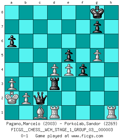 Last move : 0-1 2007 October 8 17:21:10 [Event "FICGS__CHESS__WCH_STAGE_1_GROUP_03__000003"] [Site "FICGS"] [Date "2007.07.11"] [Round "1"] [White "Pagano,Marcelo"] [Black "Porkolab,Sandor"] [Result "0-1"] [WhiteElo "2003"] [BlackElo "2269"] 1.e4 c5 2.Nf3 Nc6 3.d4 cxd4 4.Nxd4 Nf6 5.Nc3 d6 6.Bg5 e6 7.Qd2 a6 8.O-O-O h6 9.Nxc6 bxc6 10.Bf4 d5 11.Qe3 Bb4 12.a3 Ba5 13.exd5 cxd5 14.Be2 O-O 15.g4 Re8 16.g5 Bxc3 17.Qxc3 Ne4 18.Qe5 hxg5 19.Be3 f6 20.Qd4 Qc7 21.h4 f5 22.hxg5 e5 23.Qa4 Bd7 24.Qb3 Rab8 25.Qxd5+ Be6 26.Qd3 Rec8 27.f3 Rb3 28.fxe4 Rxd3 29.Bxd3 Bc4 30.Kb1 f4 31.Bc1 Bxd3 32.cxd3 Qc2+ 33.Ka2 Rc3 34.d4 Rd3 0-1 Sicilian defense Queenside Castling by player White (move 8) Kingside Castling by player Black (move 14) Player Black won this chess game. Follow this game move after move (download)Capture of the adverse King is the ultimate but not the first object of the game. (William Steinitz) Alle Schachspieler sollten auch ein Hobby haben. (Savielly Grigorievitsch Tartakower) Cuando me preguntan: -¿Cual es el secreto que te hace hacer mejores movidas que tus oponentes?, Yo respondo: Me da gusto que me pregunten eso, porque, como veran, hay una simple razón. Yo pienso mis propias movidas y dejo a mi oponente que el piense las suyas. (Alexander Alekhine) Nous vivons dans un monde échiquéen : chaque jour qui passe est un défi à relever. (Philosophe Sasha) To send light into the darkness of men's hearts - such is the duty of the artist. (Schumann)