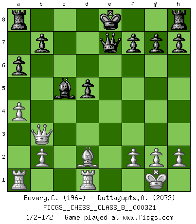 Last move : 1/2-1/2 2020 July 14 5:12:42 [Event "FICGS__CHESS__CLASS_B__000321"] [Site "FICGS"] [Date "2020.03.28"] [Round "1"] [White "Bovary,Charles"] [Black "Duttagupta,Aniruddha"] [Result "1/2-1/2"] [WhiteElo "1964"] [BlackElo "2072"] 1.d4 d5 2.c4 dxc4 3.e3 Be6 4.Nf3 c6 5.a4 Nf6 6.Na3 Bd5 7.Nxc4 e6 8.Bd3 c5 9.O-O Nc6 10.Ncd2 Bxf3 11.Nxf3 cxd4 12.Nxd4 Nxd4 13.exd4 a6 14.Qb3 Qd7 15.d5 Nxd5 16.Be4 Bc5 17.Rd1 Qe7 18.Bxd5 exd5 19.Bd2 1/2-1/2 Queen's gambit accepted Kingside Castling by player White (move 9) This chess game ended in a draw. Follow this game move after move (download)A bad day of Chess is better than any good day at work. (Anonymous) Bis jetzt ist Weiß einer wohlbekannten Analyse gefolgt. Aber jetzt begeht er einen schrecklichen Fehler: Er beginnt seinen eigenen Kopf zu benutzen. (Siegbert Tarrasch) Al jugar al Ajedrez entonces, podemos aprender: Primero: Previsión... Segundo: Prudencia... Tercero: Cautela... Y al final, aprendemos del Ajedrez el hábito de no ser desanimados por apariencias malas presentes en el estado de nuestros asuntos, el hábito de la esperanza por una oportunidad favorable y la perseveración de los secretos de los recursos. (Benjamin Franklin) La guerre est enfant de la passion, la passion est enfant du narcissisme et le narcissisme est l'enfant. (...) Une autre partie ? (Thibault de Vassal) True nature is revealed in times of difficulty. (Chinese proverb)
